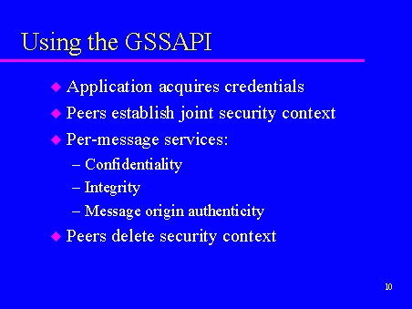 - A pair of communicating applications establish a joint security context using their credentials. The security context is a pair of GSSAPI data structures that contain shared-state information, which is required in order that per-message security services may be provided.