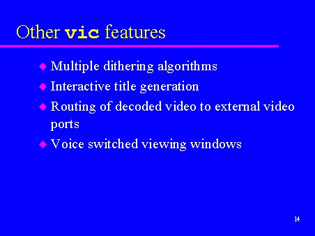 Vic has several dithering algorithms for representing continuous-tone color video streams on color-mapped displays. The user can trade of run-time complexity with quality. An error-diffusion dither gives the highest quality but at the greatest CPU cost, while a direct color quantization results in the lowest CPU load but yields relatively low quality. An ordered dither (derived from nv) gives moderate quality with low complexity.